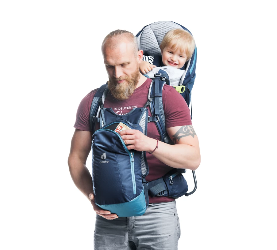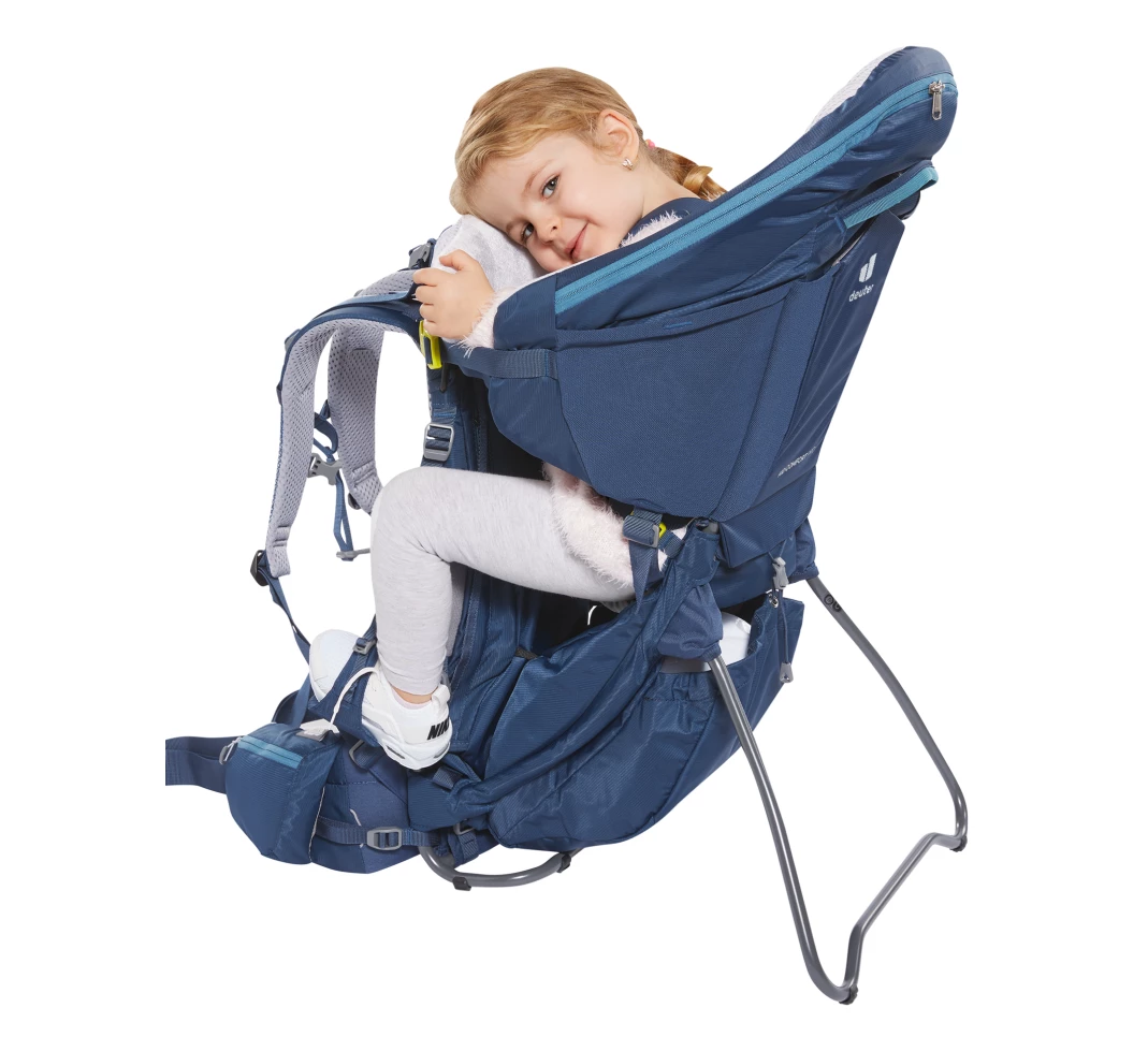 The pro child carrier comes with an integrated, separately useable daypack for quick runs to the changing room. There is also a fixed sun roof and a mirror for a quick rear-view of the child on the back. The load is transferred perfectly, thanks to the new Aircomfort Sensic Vario mesh back system. The child carrier fits snuggly while the back is fully ventilated. The large, soft pillow gently braces the tired childโs head even in the corners and supports a relaxing nap. The side entry and the easy-to-use harness system ensure safety, guaranteed by the TรV GS safety seal of approval.