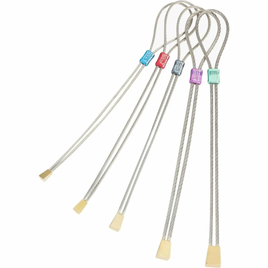 Brass Offsets are crucial for protecting small flared cracks, often fitting perfectly where nothing else will go. The brass used for the head of the nut is soft enough to bite into placements, but hard enough to resist deforming and pulling through. Wires are soldered directly into the nut head, allowing a thicker wire to be used and increasing overall strength. The color coded swage gives easy size selection and allows the Brass Offset to self equalize when loaded, making the most of marginal placements.