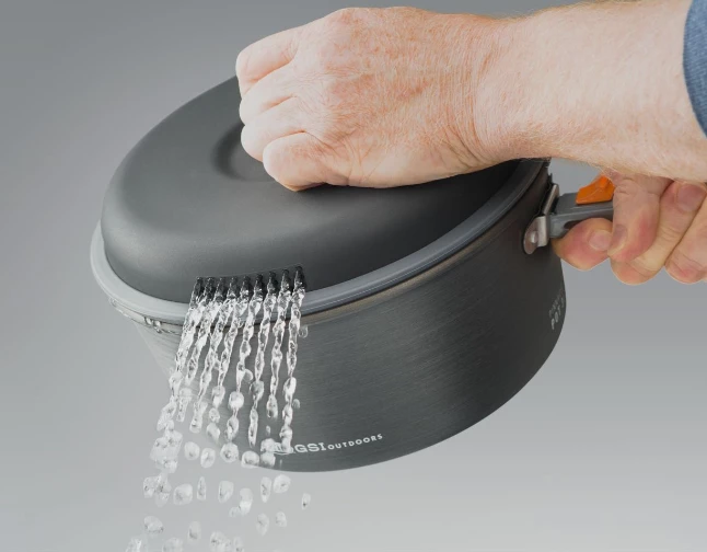 These durable, non-stick coated, hard anodized aluminum pots are the ultimate in design, space efficiency and cooking performance. Every set includes a 2 pots, a frypan, 2 nylon strainer lids, a cutting board for a variety of prep duties, a folding pot handle, and a welded stuff sack to keep everything organized and doubles as a sink for washing.