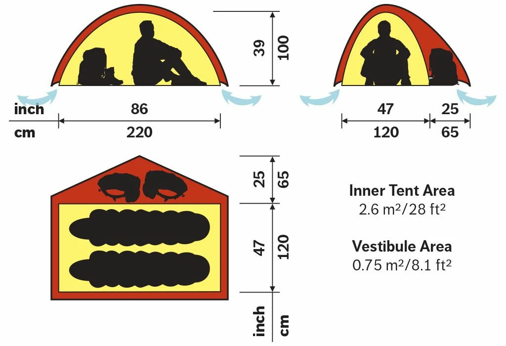 THE NIAK expands on the concept of very lightweight yet remarkably strong three-season tents that was introduced with our one-person Enan. Ideal for two people who want to go as light as possible, the Niak is also a veritable lightweight palace for one person. Its dimensions accommodate two people, but its single door and lengthwise vestibule make it somewhat less comfortable than other two person models, so the Niak is especially good for a parent and a child, or for one person and a dog. It is also the perfect three-season solo tent when you want to be as comfortable as possible at a low weight. As with other Yellow Label models, the Niak’s outer tent is made from our lightest weight Kerlon 1000, and it is supported by the same DAC NSL 9 mm poles used in our Red and other Yellow Label models. Its simple, two pole design – inspired by our Red Label Unna solo tent – is quick to pitch and very stable, and the single vestibule can be completely rolled away to maximize air flow through the full mesh inner tent door. In addition, catenary curves along the bottom edges of the outer tent create space that both allows for constant air flow and also ensures that the outer tent is stretched properly for optimal performance. Prior to its introduction, the Niak went through well over 250 backcountry nights of use, in all types of weather, in Scandinavia and the US, as well as in the Alps and in Scotland. Two person users appreciated its light weight, and solo users loved that it offered such roomy luxury at such a surprisingly low weight. All proclaimed it as an outstanding choice for any summer or warm weather trip.