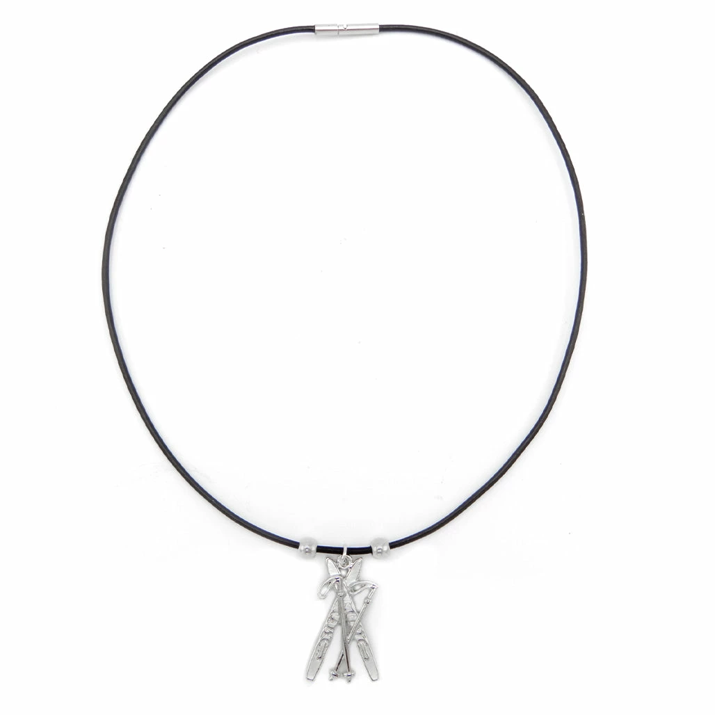Show you’re ready for any mountain with this necklace from LILO Collections Active Jewelry line, featuring a pair of elegantly detailed skis and poles on a leather cord. Size: Necklace is approx. 17″ diameter, with 2mm leather cord. Handmade in Virginia, USA using Spanish leather and European hardware