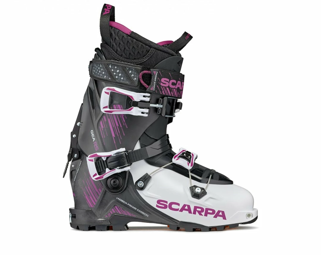 The new Gea RS is Scarpa’s stiffest, most powerful women’s specific AT boot and is the perfect blend of performance and backcountry functionality. The Gea RS utilizes a bi-injection carbon-infused Grilamid® shell to add power and rigidity without adding weight. The Evo V Frame cuff, which now utilizes Grilamid Bio – a planet friendly, renewable resource – also increases torsional rigidity while also providing a 60-degree range of motion for long efficient strides. The HRS strap keeps your heel planted where it should be to increase performance and comfort on the way up and down while the lower Wave Closure system provides the same security as a 2-buckle system at a fraction of the weight. The glove-friendly Finger Strap features RECCO® Technology for increased avalanche searchability. The Gea RS is for experienced backcountry skiers looking for uncompromising performance.