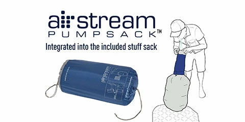 - Quick and easy inflation, deflation and adjustment made possible by patent-pending multi-function valve and supplied Airstream Pump™/stuff sack.