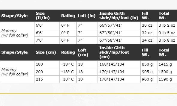 Wasnโt it the Big and Tall Gazzette, that called our Kodiak the XL (or excel?) of sleeping bags? This 0ยฐ mummy bag has a full 66โณ of shoulder girth and 41โณ of foot girth to fit any bear sized person. 30 oz. of down fill this bag with 7โณ of loft and the continuous baffles keep the bag versatile as the weather changes. The draft tube and full down collar are all capped with Gore Windstopperโขfabric, and amply filled with down. The Gore Windstopperโข shell makes this bag stand firm against any weather. All this with a total weight of only 3 lbs. 2 oz. No matter what your size, we have a bag to fit! The Kodiak is also available in 7โฒ lengths!
