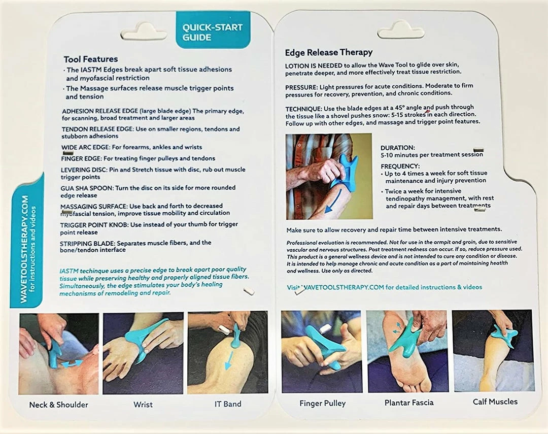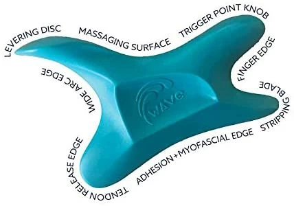 The Wave Tool boasts a myriad of surfaces, edges, and curves to fit any body contour and any soft tissue problem. Precise “scraping” edges break down scar tissue and manage chronic conditions such as tendinopathy and fascial adhesions. The more rounded Guasha spoon and the massage surfaces are great for increasing blood flow. Trigger point knobs apply deep pressures to stubborn knots. The levering disc excels at pin and stretch techniques for myofascial release. It’s your all-in-one soft tissue release tool.